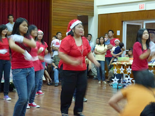 Here is how it works. Each ward comes up with a dance to a Christmas song. Each ward decorates a table and brings food for their own ward. Simple right? Well there are 11 wards and branches in the Angeles Stake. It was amazing to me to see all of these women preforming in front of their peers. I don't think this would happen back home. But these ladies had a great time.